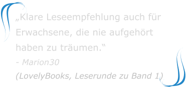 „Fantasievolles, spannendes Jugendbuch mit einer zauberhaften Welt, das aber auch wichtige Jugendthemen behandelt“ - katze267(LovelyBooks, Leserunde zu Band 1) „Klare Leseempfehlung auch für Erwachsene, die nie aufgehört haben zu träumen.“ - Marion30(LovelyBooks, Leserunde zu Band 1)